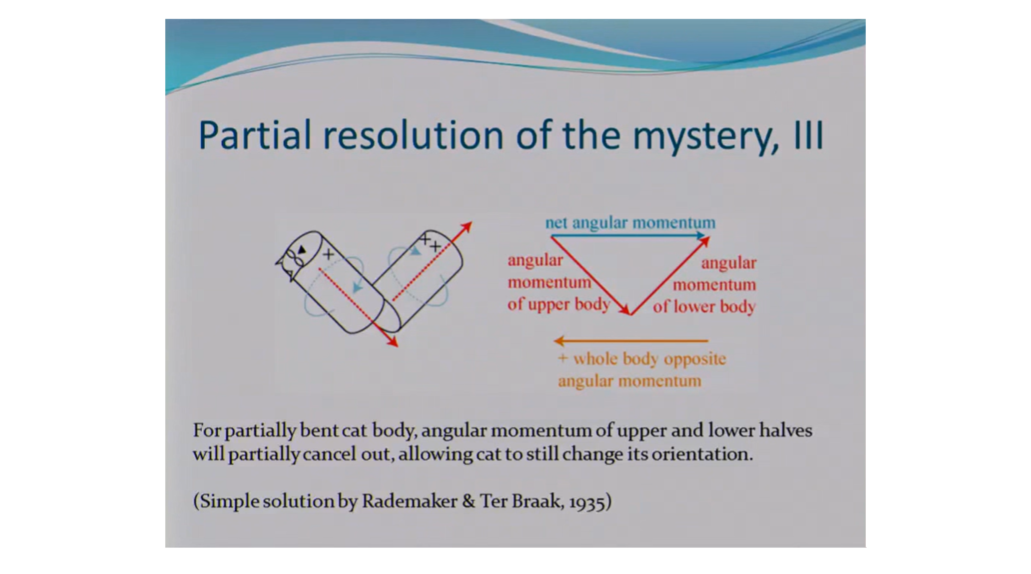 1935년 네덜란드의 생리학자 G.G.J. Rademaker 와 J.W.G. Ter Braak은 다른 해석을 제시합니다. 떨어지는 고양이 사진에서 볼 수 있는 '굽어진 허리'가 중요하다는 아이디어입니다. 그들은 고양이가 허리를 굽혀 상체와 하체를 회전하는 경우를 생각했습니다. 그러면 각운동량 보존을 유지하면서도 공중에서 몸을 뒤집을 수 있다는 것입니다.