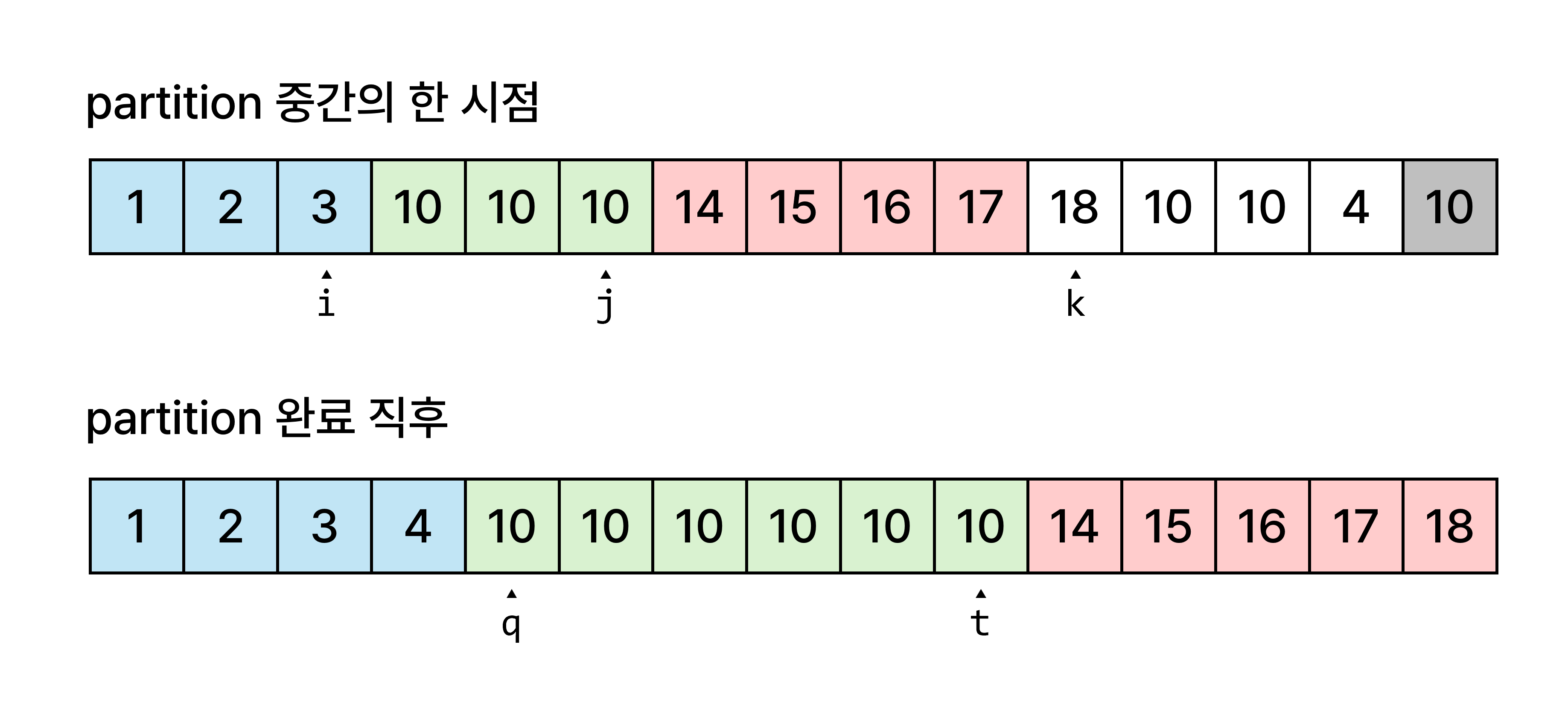 기준 원소보다 작은 그룹, 같은 그룹, 큰 그룹 총 세 구역으로 나누어 분할하는 방법입니다. 구현은 조금 더 복잡하지만 문제를 확실하게 해결할 수 있습니다.
