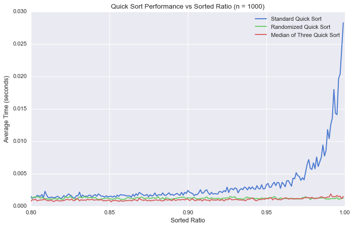 원소의 개수가 1000개인 경우 정렬된 비율에 따른 정렬 시간을 계산해보았습니다. 정렬된 비율이 1에 가까워질수록 기존 퀵 정렬 알고리즘의 시간은 점점 증가하는 반면, 수정된 알고리즘은 동일한 성능을 보여주고 있습니다.