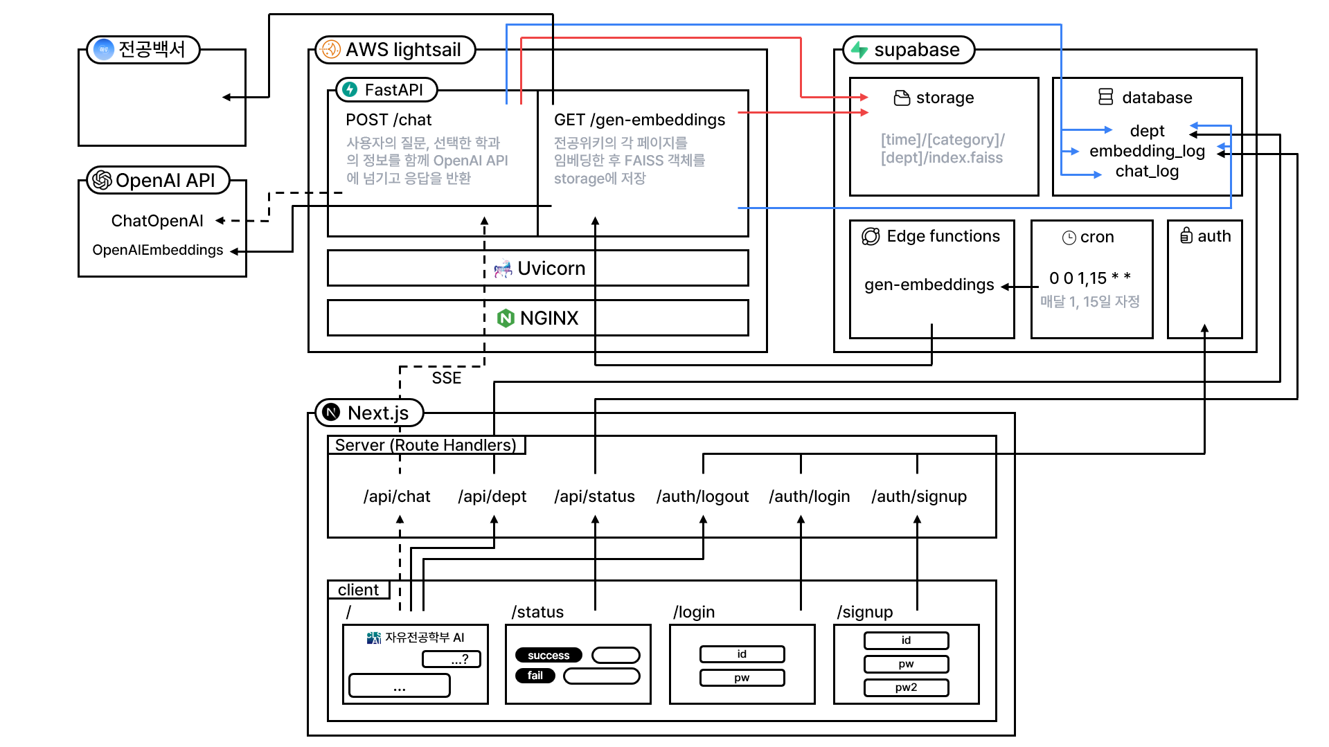 사용자가 질문을 하면 /chat 엔드포인트에 POST 요청으로 질문의 내용과 선택한 학과 전달됩니다. 백엔드에서는 학과에 해당하는 FAISS 파일들을 supabase storage에서 꺼내오고, 질문과 가장 유사한 내용들 일부 추출합니다. 이를 사용자의 질문과 함께 OpenAI API에 전송하여 응답을 받습니다. 이 결과를 다시 사용자에게 전달해줍니다.