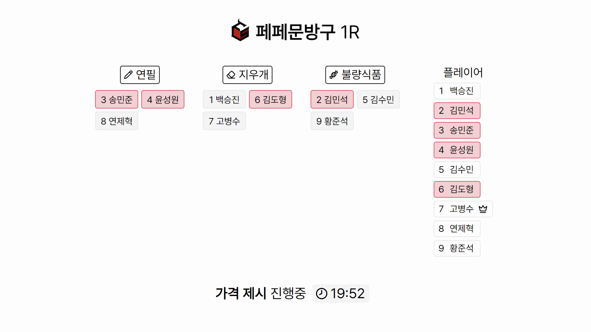 2R 가격 제시 진행중 (가격 제시를 마친 플레이어는 화면에서 빨간색으로 표시됨)