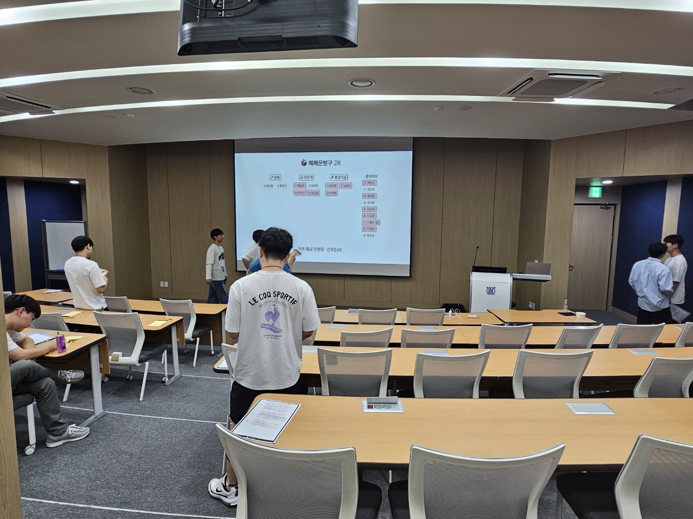 저희는 해당 게임을 기획할 때 기존의 더 지니어스 프로그램 포맷을 많이 참고하였습니다. 세트장 한 가운데에 있는 TV 화면에서 진행 상황 등을 보여주던 기존 프로그램처럼, 강의실 앞쪽 스크린에서 진행 상황 및 결과를 보여주고 싶었습니다. 또한 딜러룸을 만들어 플레이어의 선택이 외부로 유출되지 않도록 보장하고 싶기도 했습니다.