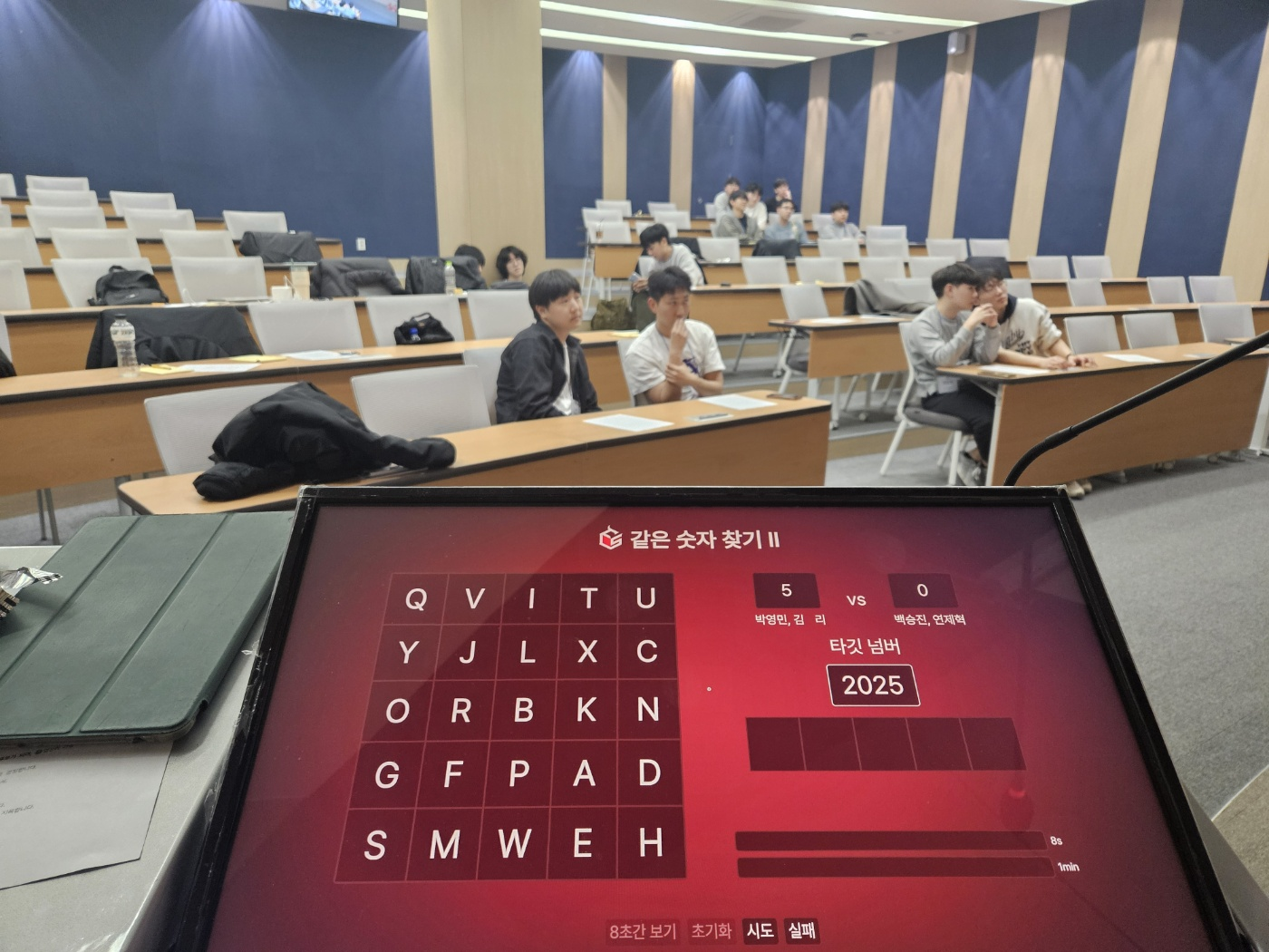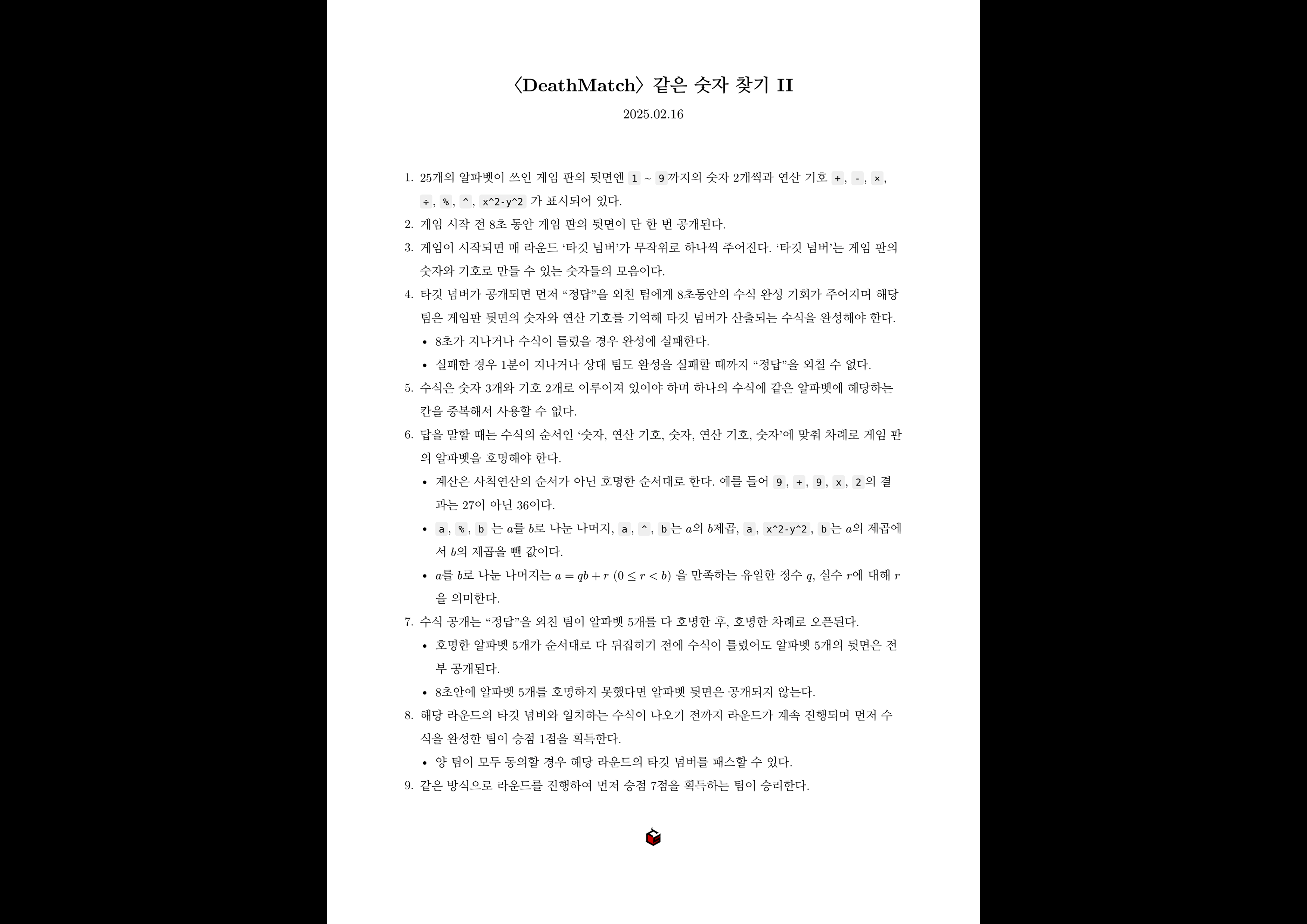 따라서 이번 데스매치는 모두가 즐길 수 있는 게임으로 준비하게 되었습니다. 가장 쉬운 방법은 〈결! 합!〉이나 〈같은 숫자 찾기〉와 같은 퀴즈류의 게임이라고 생각했고, 그중에서도 2대2 게임에 어울리는 같은 숫자 찾기 게임을 응용한 〈같은 숫자 찾기 II〉게임을 준비하게 되었습니다.