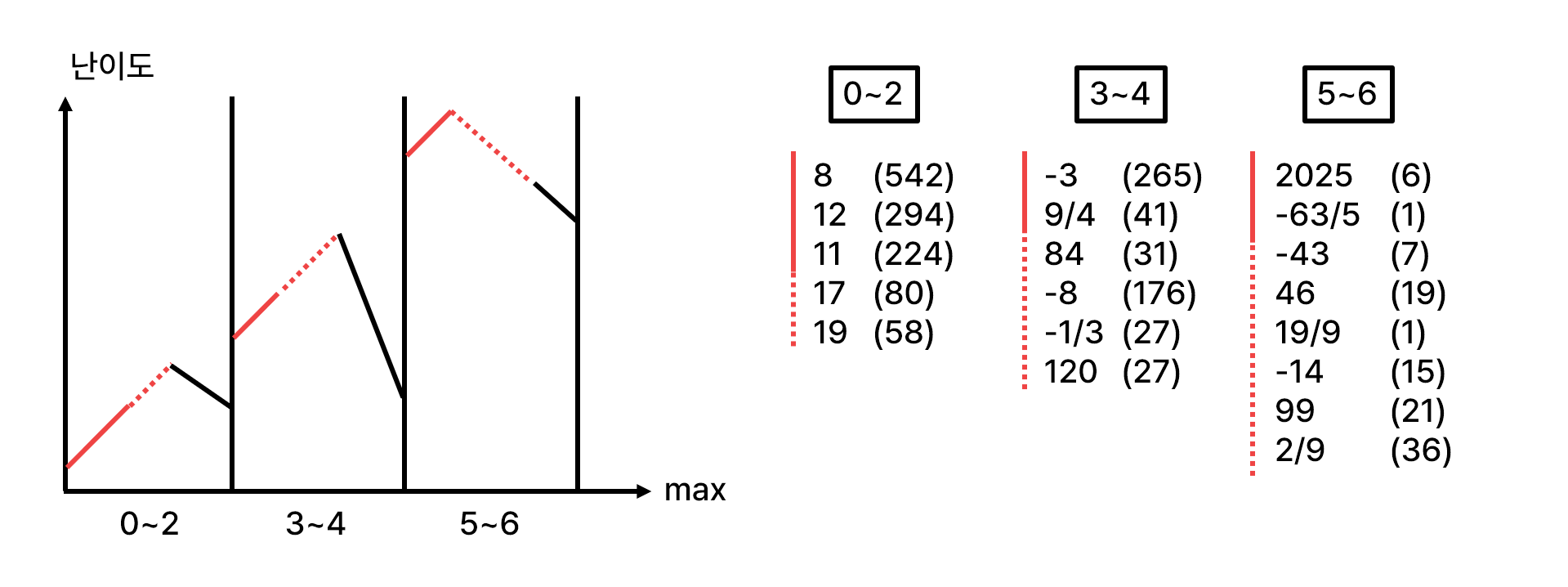 타깃 넘버 오른쪽에 괄호로 적혀있는 수는 해당 타깃 넘버를 만들 수 있는 조합의 수입니다. 해당 수가 클수록 쉽고, 작을수록 어려워진다고 가정했습니다. 또한 빨간색 실선은 해당 구간에서 필수적으로 풀어야 하는 문제, 빨간색 점선은 풀수도 있고 안풀수도 있는 문제들입니다. 위 그림에는 적지 않았지만 타깃 넘버가 패스될 것을 고려하여 각 구간별로 여유분의 타깃 넘버를 추가하였습니다. 이들은 그래프에서 검은색 실선으로 표시되어 있습니다.