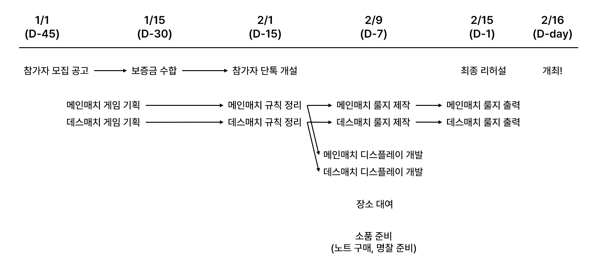 다음에 또 오프라인을 운영할 때 참고하기 위해 준비 과정도 간단하게 정리해보았습니다. 준비 자체는 1월 1일부터 시작되었지만, 처음부터 많은 시간을 투자하지는 않았습니다. 메인매치와 데스매치의 큰 틀을 잡아놓고 밸런스를 잡으며 세부적인 룰을 수정하는 과정이 기간상 한달 정도 걸렸던 것 같습니다. 그 이후 게임 일주일 전부터 소품 준비, 장소 대여, 디스플레이 개발 등 전체 업무의 절반 이상을 처리하게 되었습니다.