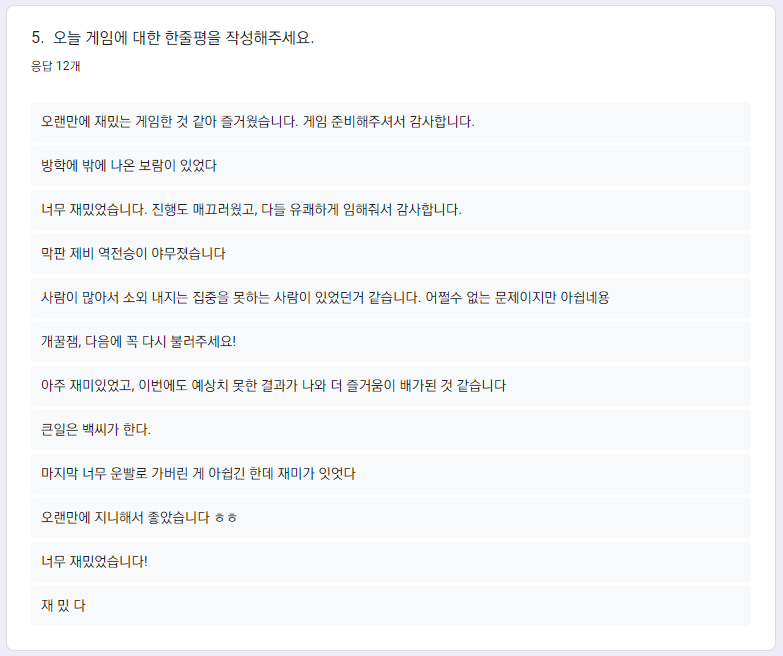 결과적으로 돌이켜보면 라운드마다 엽전 개수가 변하는 등 변칙적인 룰이 필요했던 것 같습니다. 이러한 룰이 없다보니 6라운드 전체가 비슷한 흐름으로 흘러갔고, 빈틈을 파고드는 획기적인 전략보다는 엽전 개수를 유지하는 보수적인 전략이 채택되어 예측 불가능성이 줄어들게 되었다고 느낍니다.